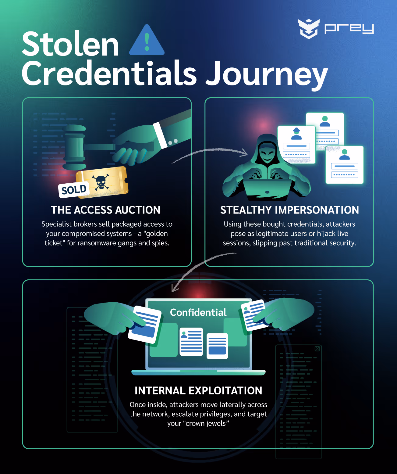2. Phishing & session hijacking: Credentials harvested from phishing campaigns or info-stealing malware are gold. Attackers can reuse them to waltz into active sessions or impersonate legitimate users, often flying under the radar of traditional security tools.