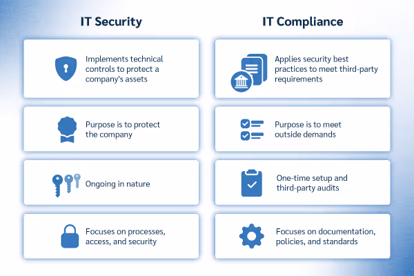 IT security encompasses broader technical safeguards chosen by organizations based on their unique risk profile, threat landscape, and security maturity level. While compliance provides standardized requirements, security teams may implement additional protections that exceed regulatory minimums to address emerging threats or protect intellectual property.