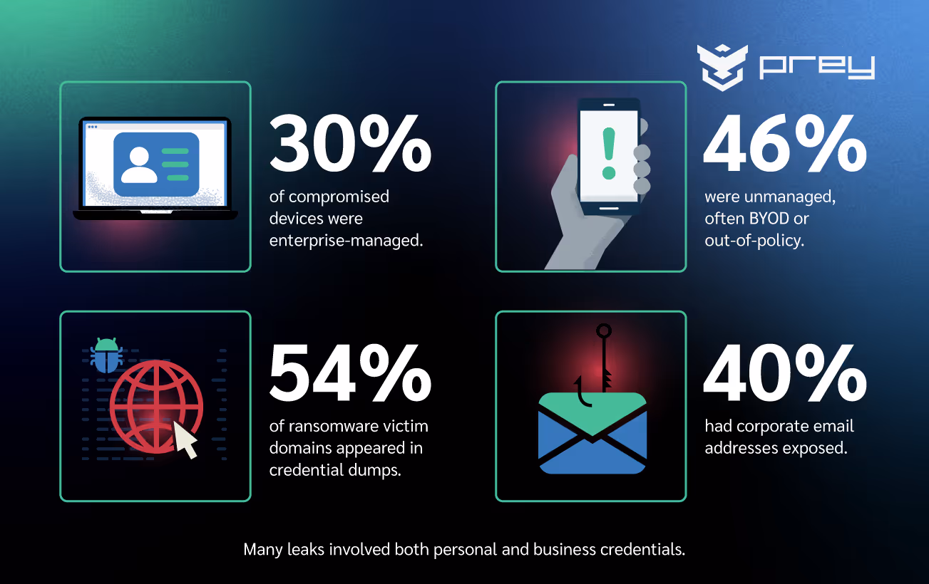 The connection to ransomware is striking. Of the organizations hit, 54% had their domains show up in credential dumps, and 40% had corporate email addresses leaked alongside them. These aren't just loose ends—there’s strong evidence that access brokers are using these stolen credentials to sell ready-made entry points, thanks in large part to infostealer malware doing the heavy lifting.