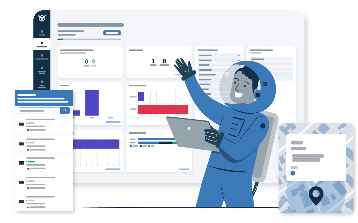 Maneja miles de equipos en la solución empresarial, organiza tu inventario con etiquetas, envía acciones en masa fácilmente y monitorea tu flota y sus datos globalmente.